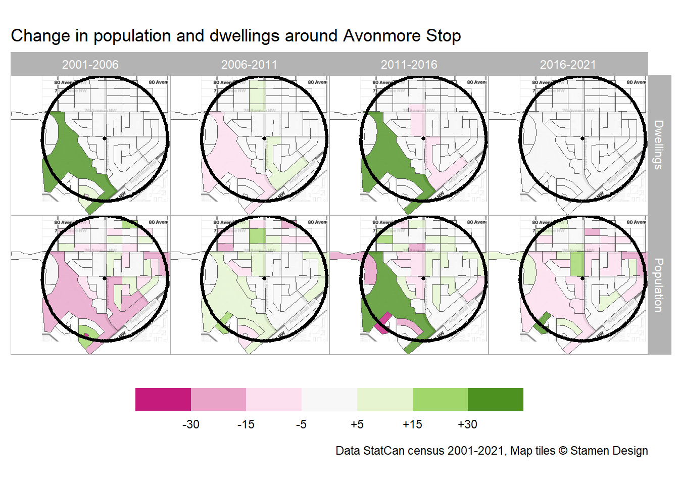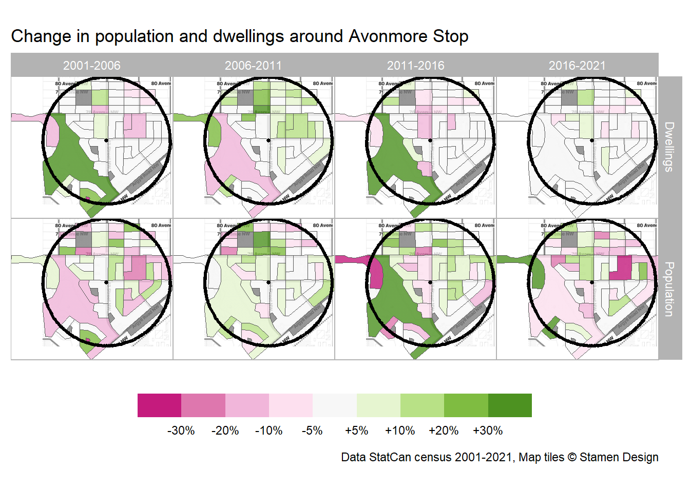 Figure 6: Percent change in population and dwellings around Avonmore Stop