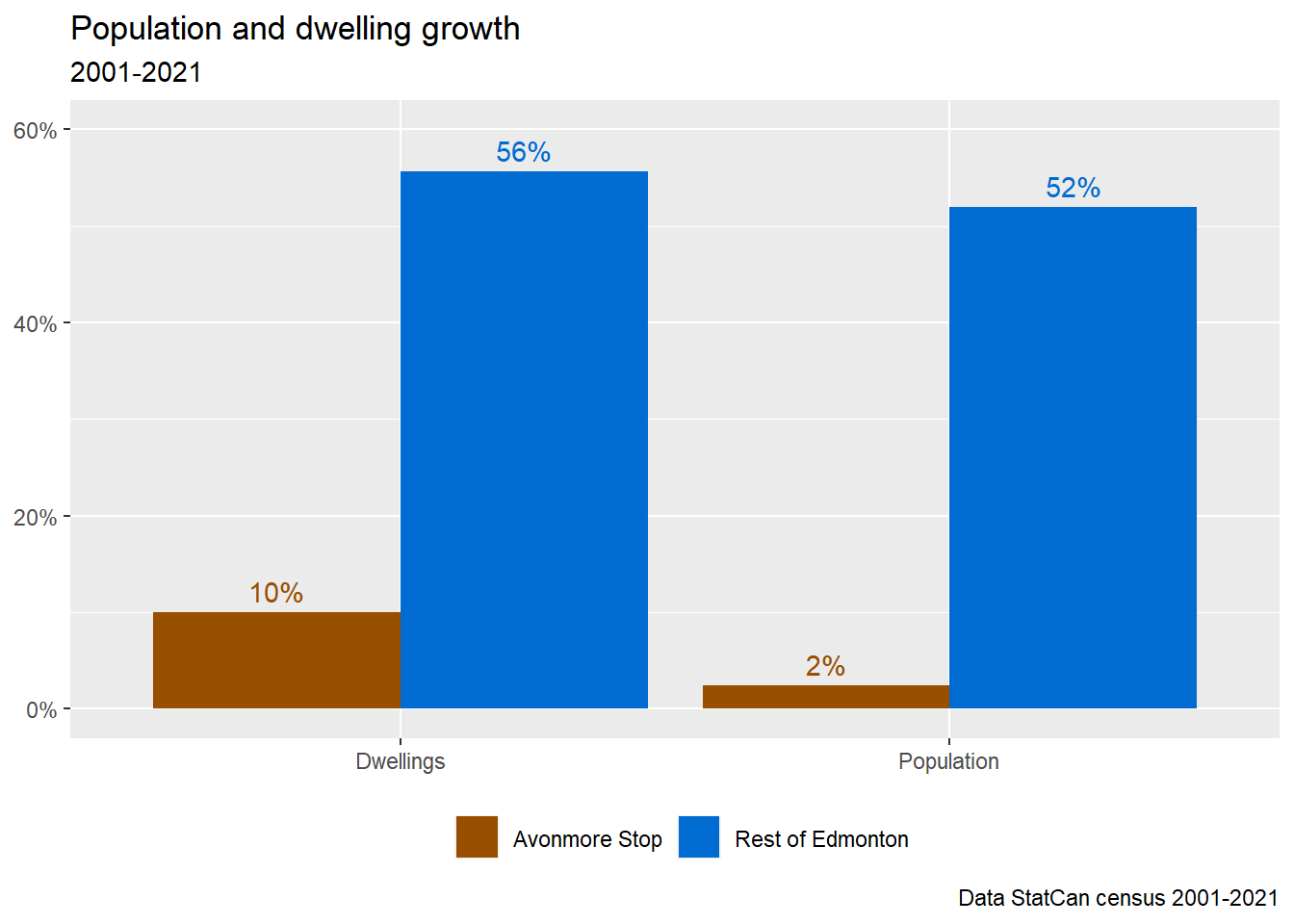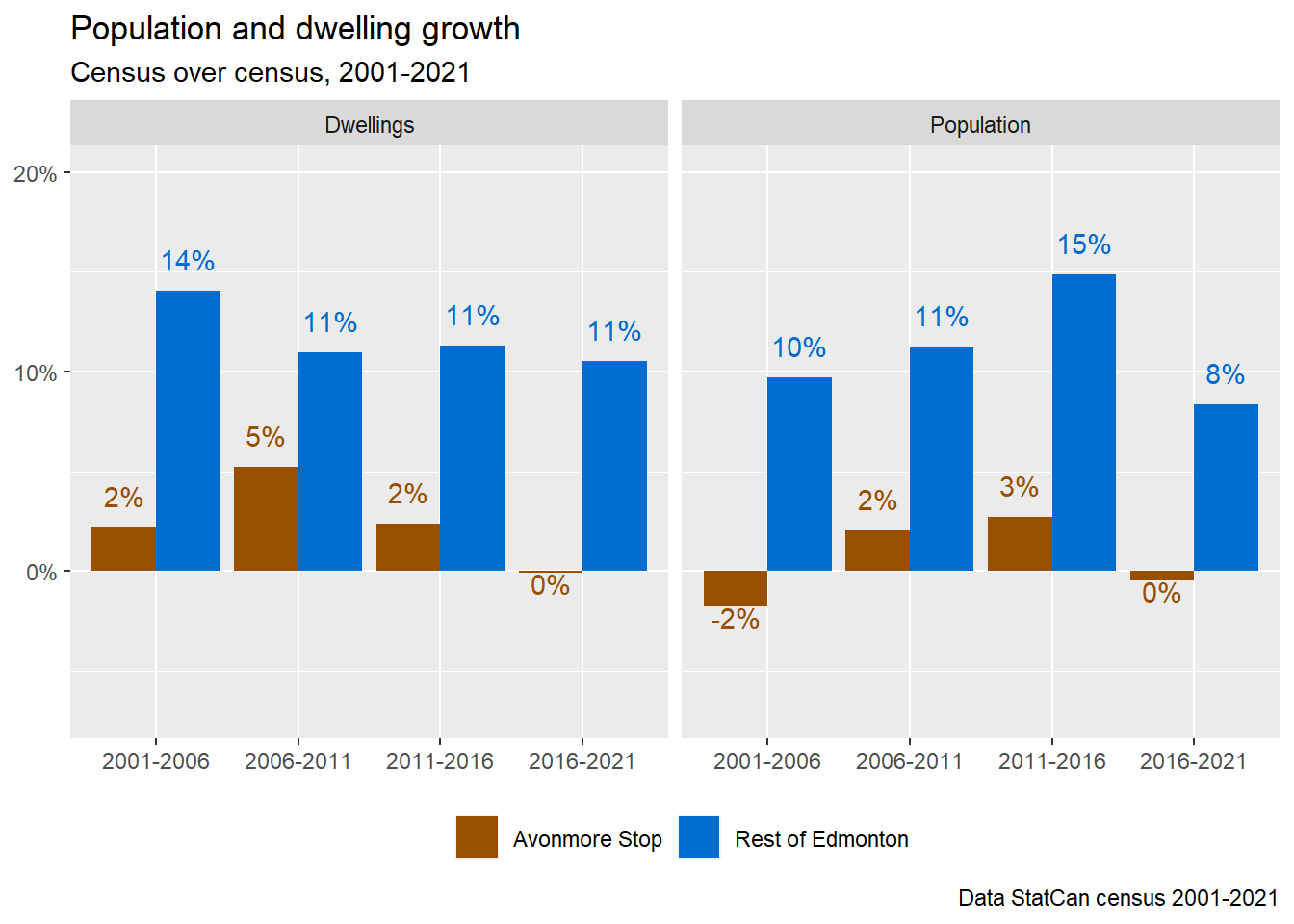 Figure 7: Census-over-census population and dwelling growth in the Avonmore Stop area and rest of Edmonton, 2001-2021
