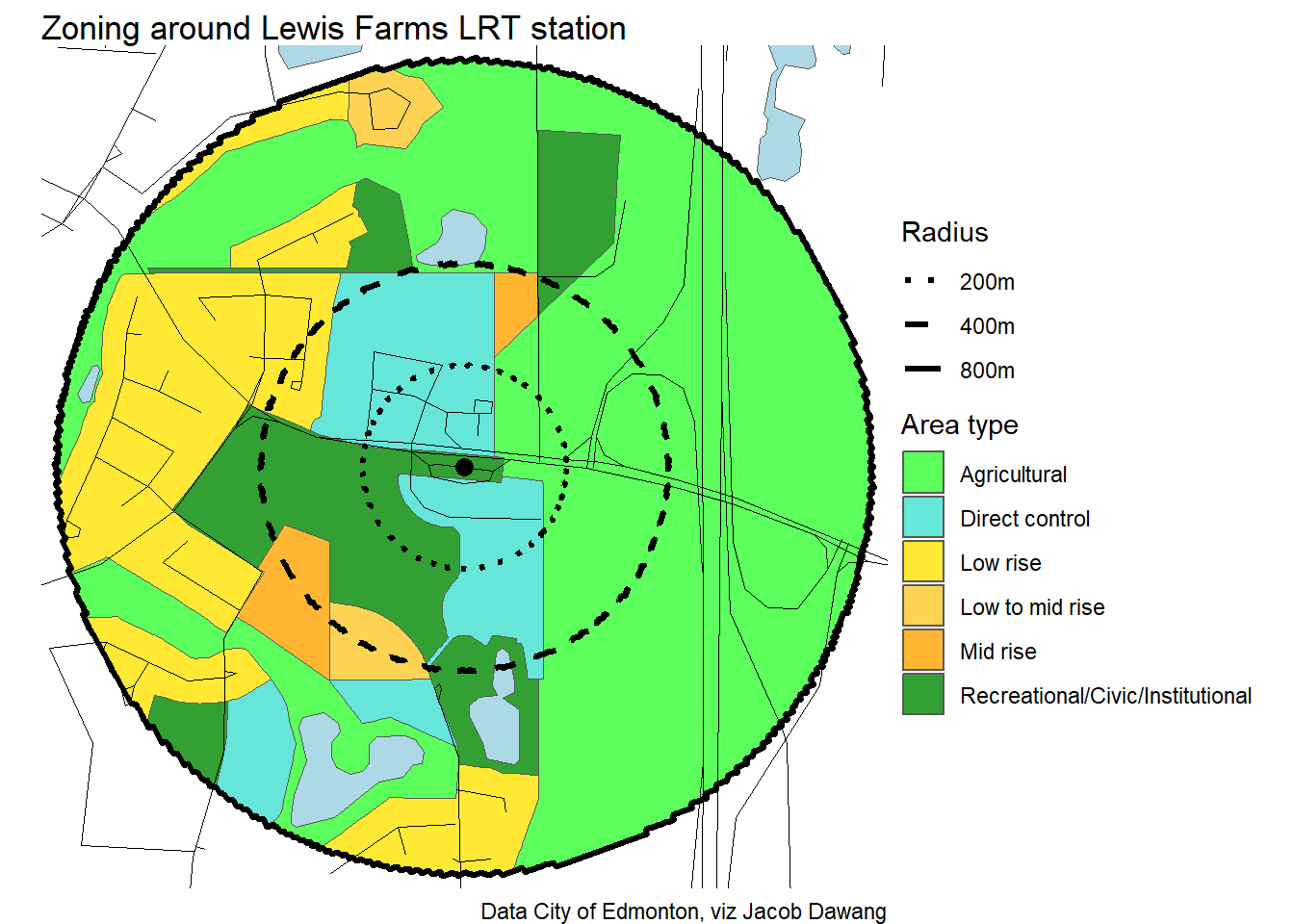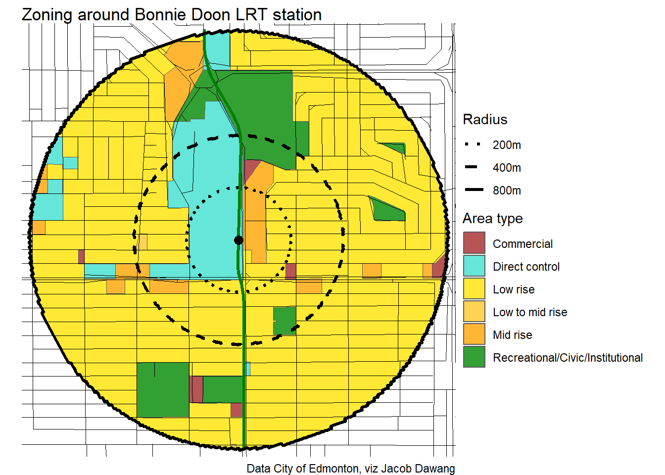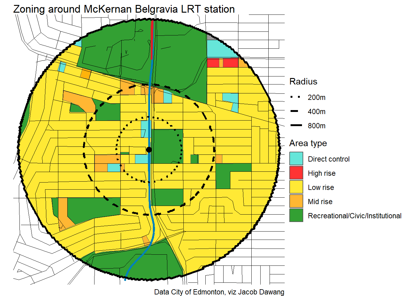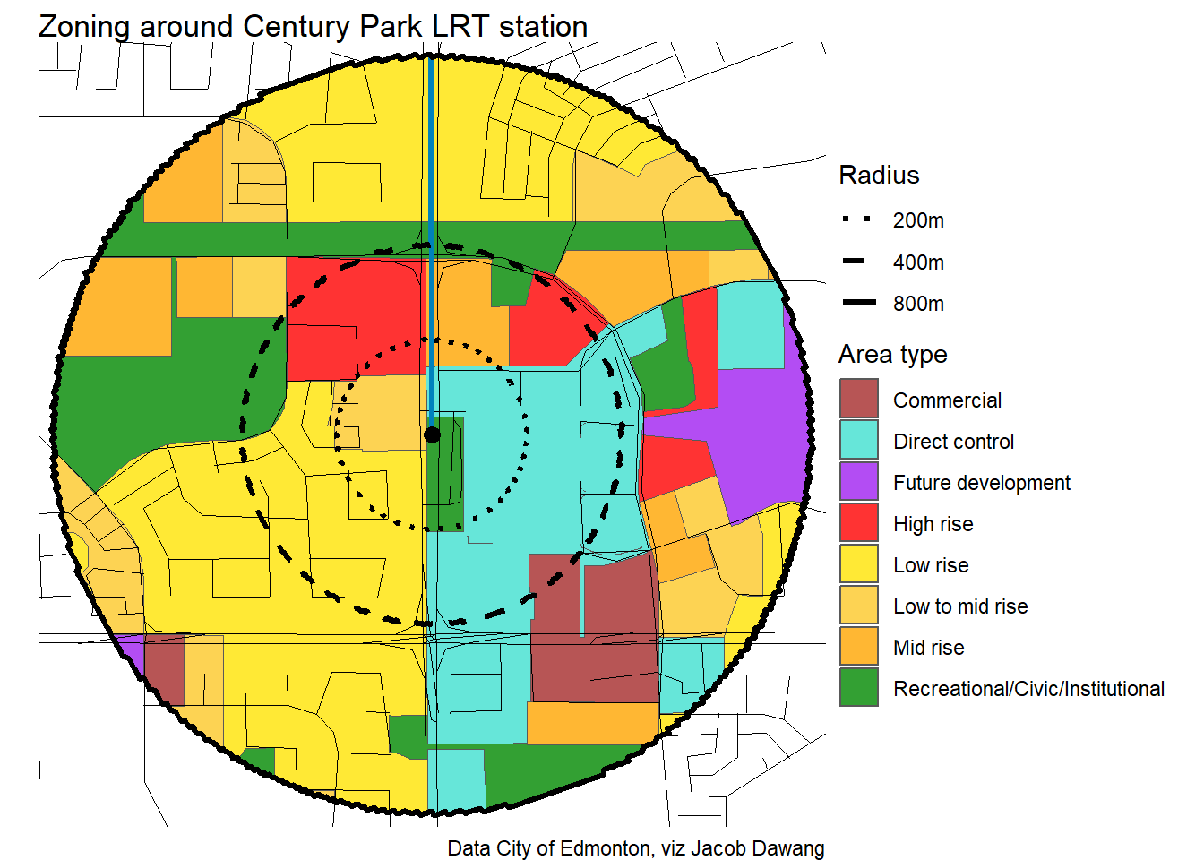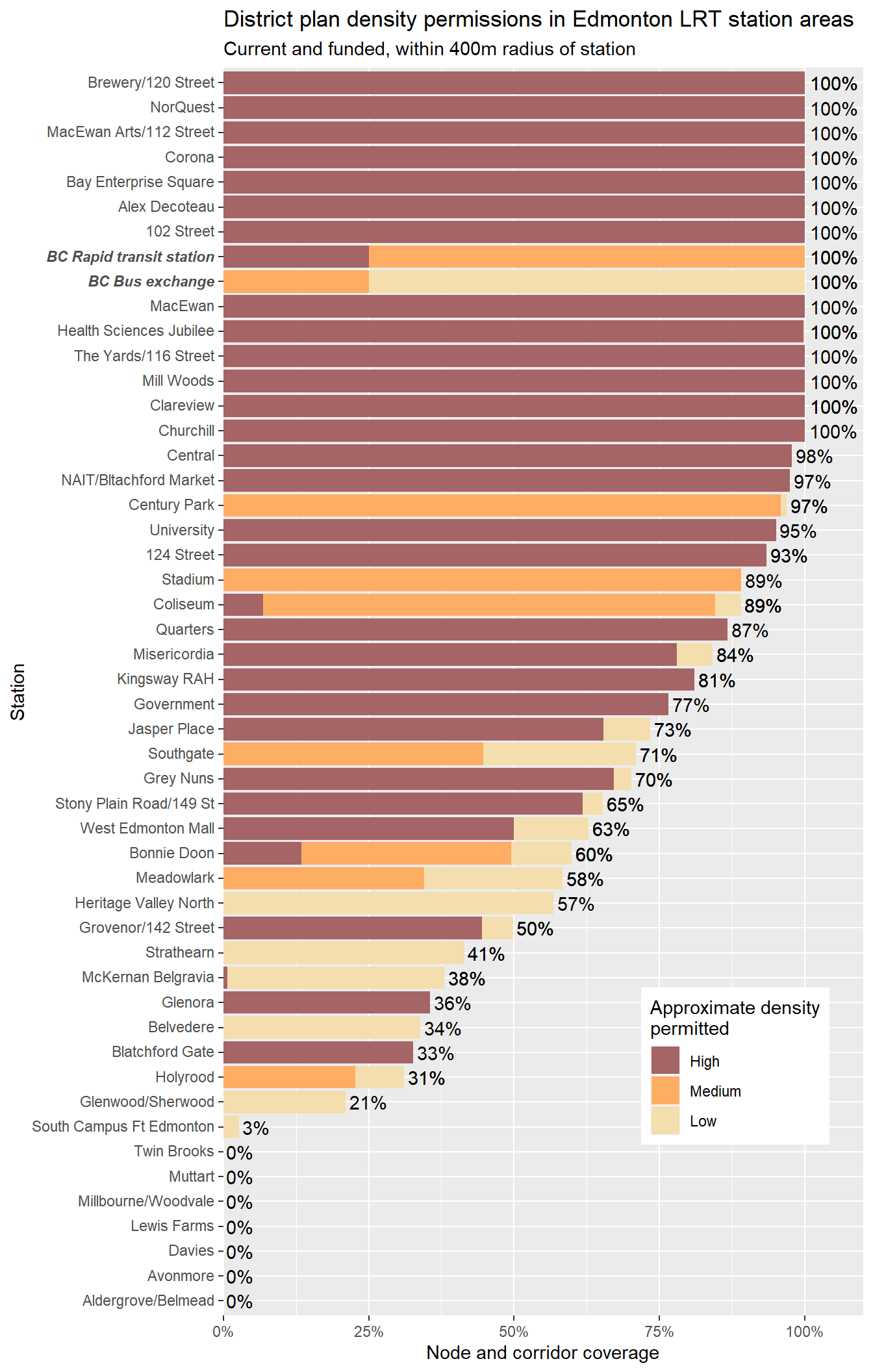 Administration has released the final draft district plans and policy with some minor changes to the policy and minor adjustments to the boundaries of some nodes and corridors. With this, they have also thankfully released open data for the node and corridor boundaries, which makes compiling plots and maps easier. Given this new data, I’m redoing all the charts and maps from my previous post where I looked at what planning permissions district planning would give around Edmonton’s current and funded LRT stations.
