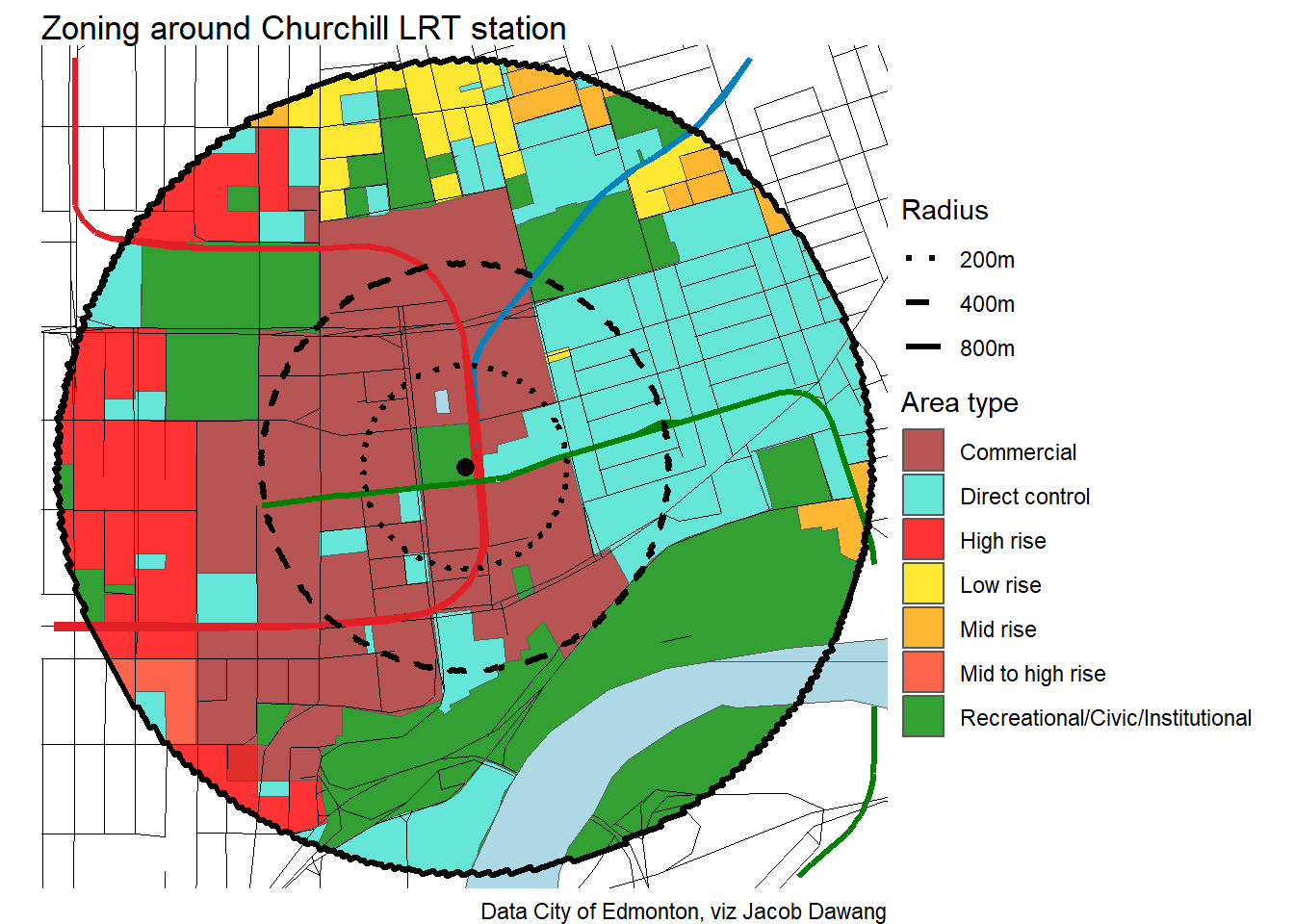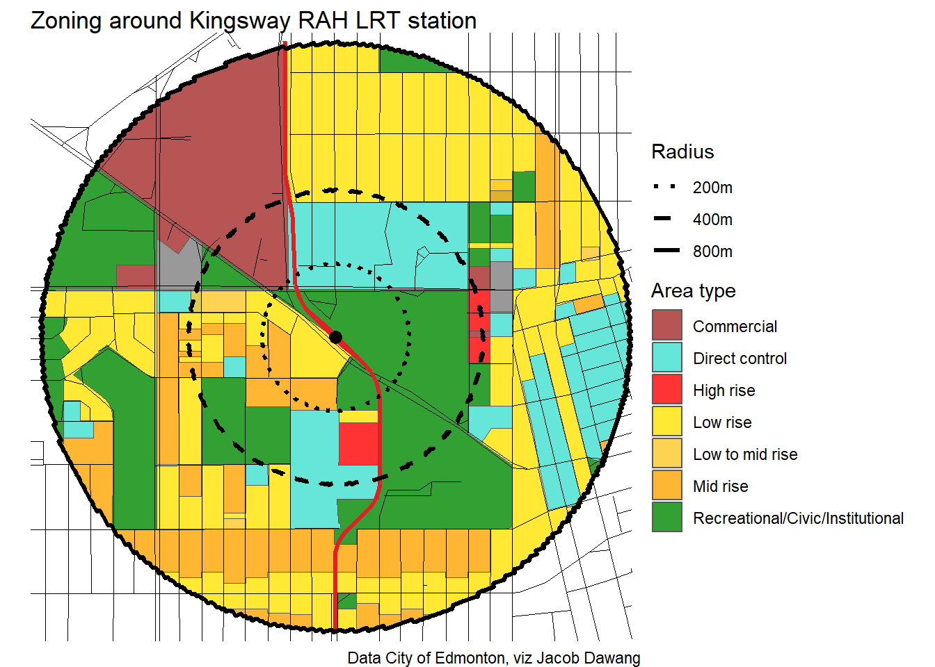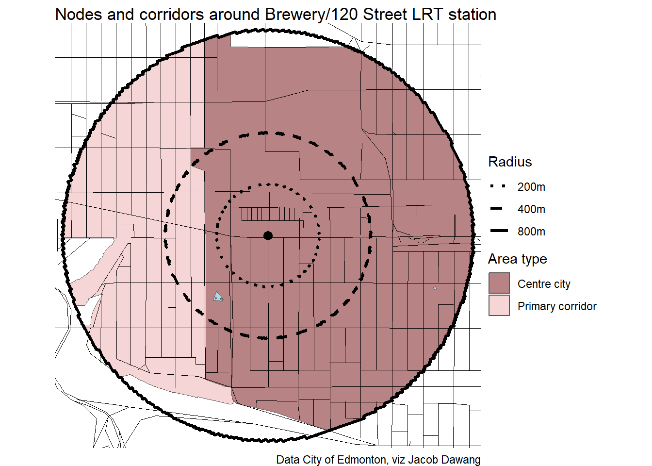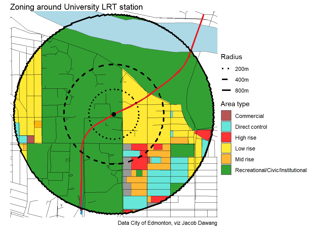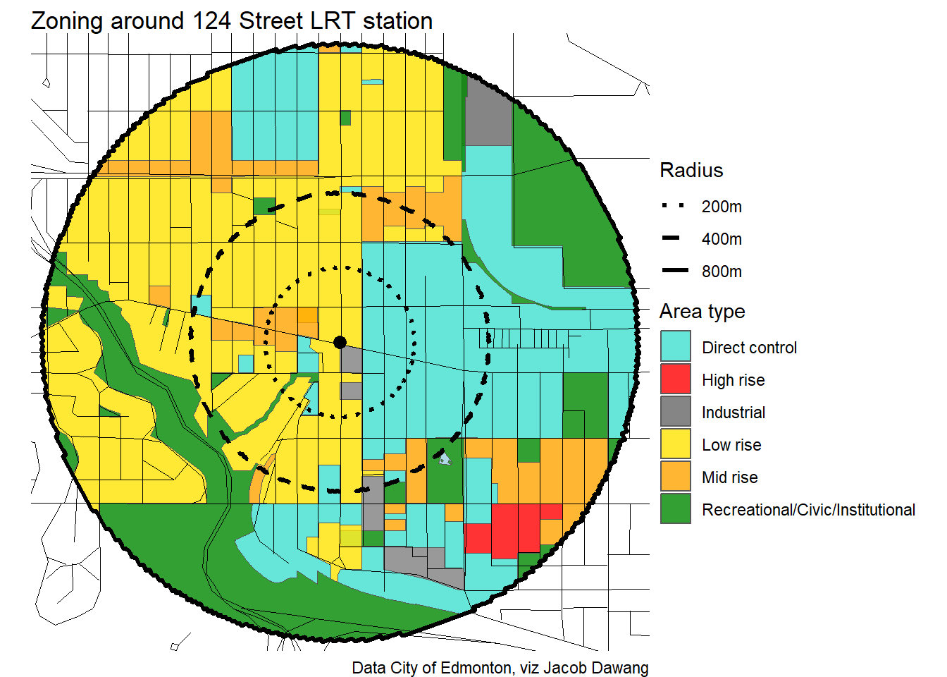 Administration has released the final draft district plans and policy with some minor changes to the policy and minor adjustments to the boundaries of some nodes and corridors. With this, they have also thankfully released open data for the node and corridor boundaries, which makes compiling plots and maps easier. Given this new data, I’m redoing all the charts and maps from my previous post where I looked at what planning permissions district planning would give around Edmonton’s current and funded LRT stations.
