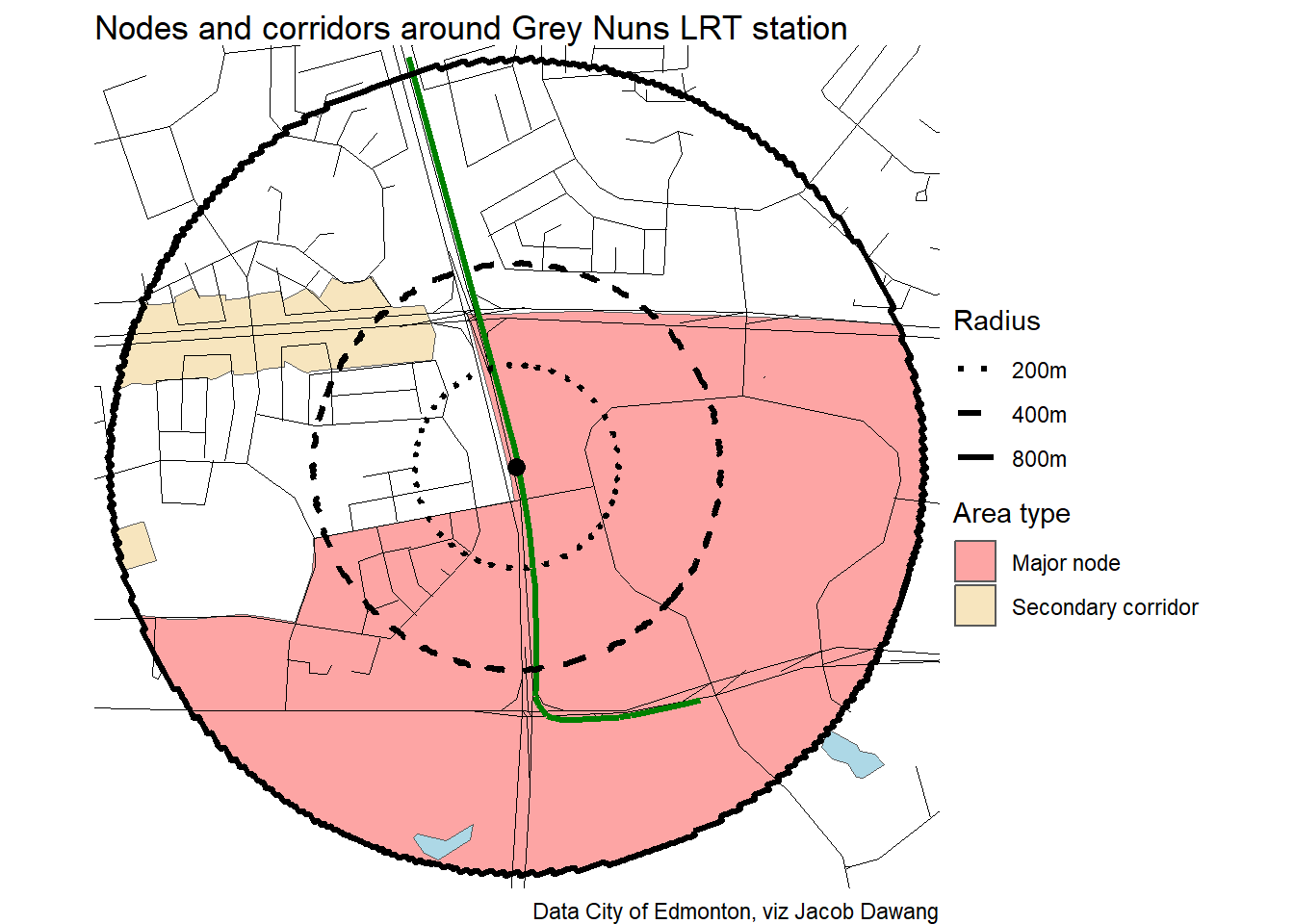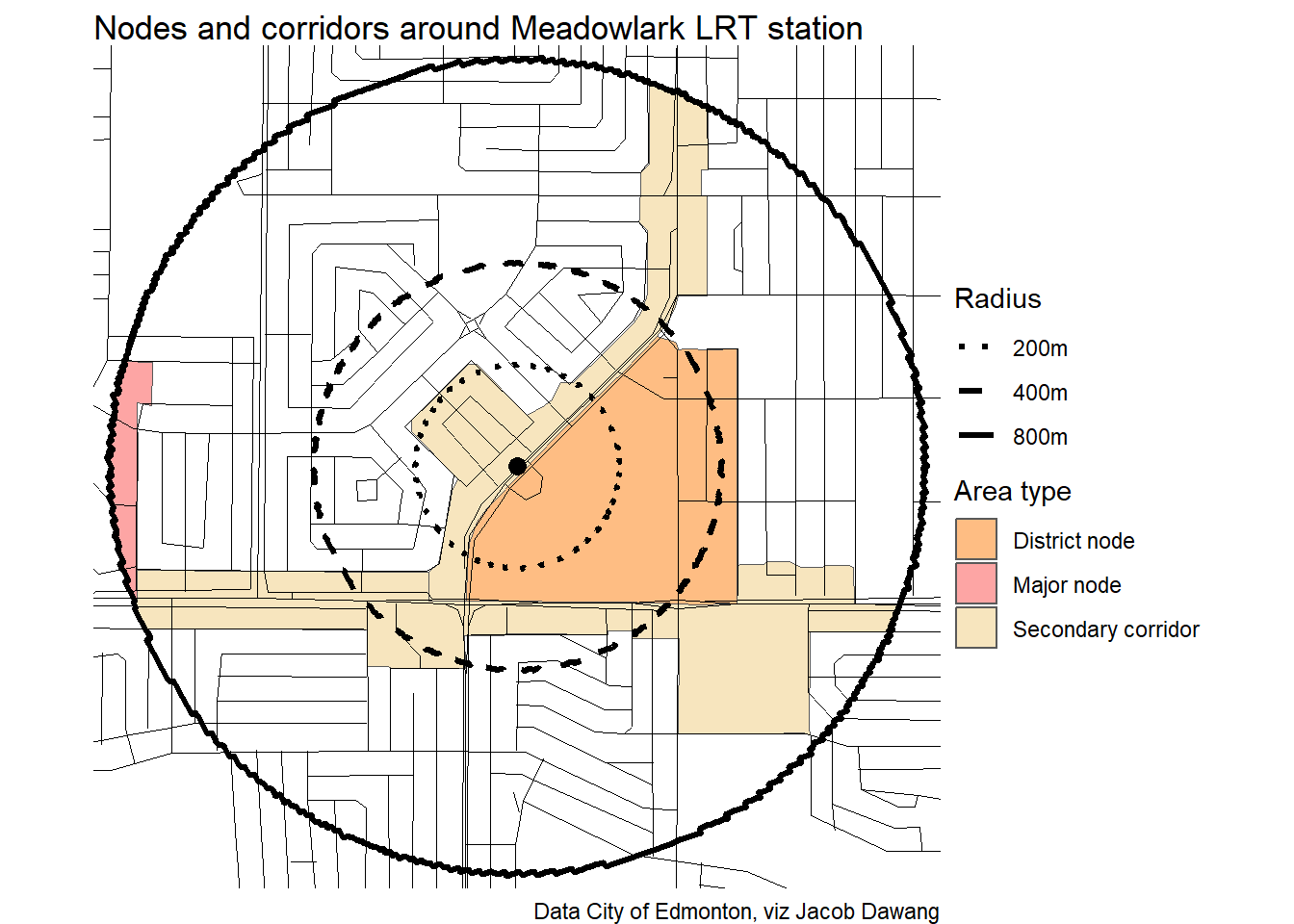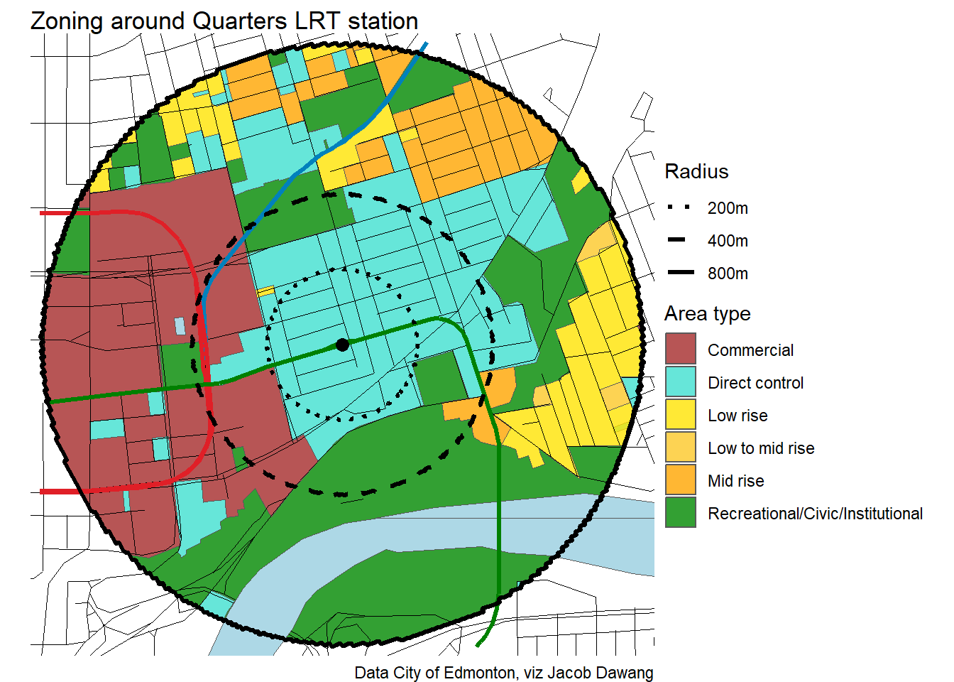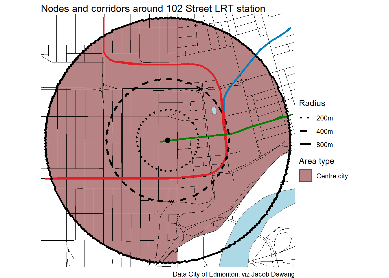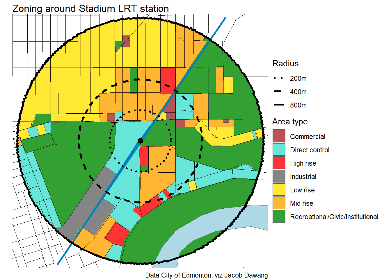 Administration has released the final draft district plans and policy with some minor changes to the policy and minor adjustments to the boundaries of some nodes and corridors. With this, they have also thankfully released open data for the node and corridor boundaries, which makes compiling plots and maps easier. Given this new data, I’m redoing all the charts and maps from my previous post where I looked at what planning permissions district planning would give around Edmonton’s current and funded LRT stations.