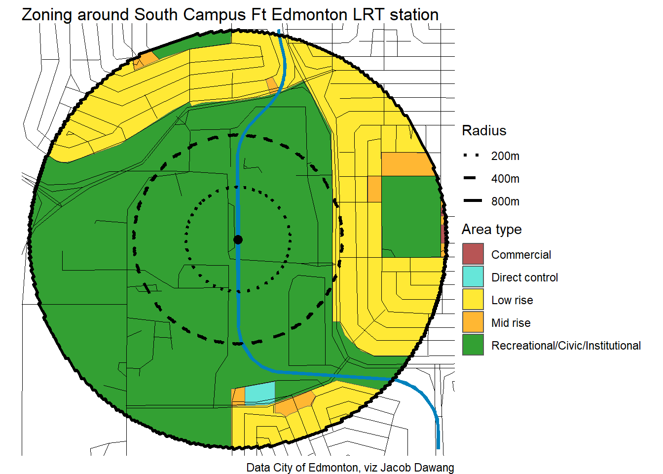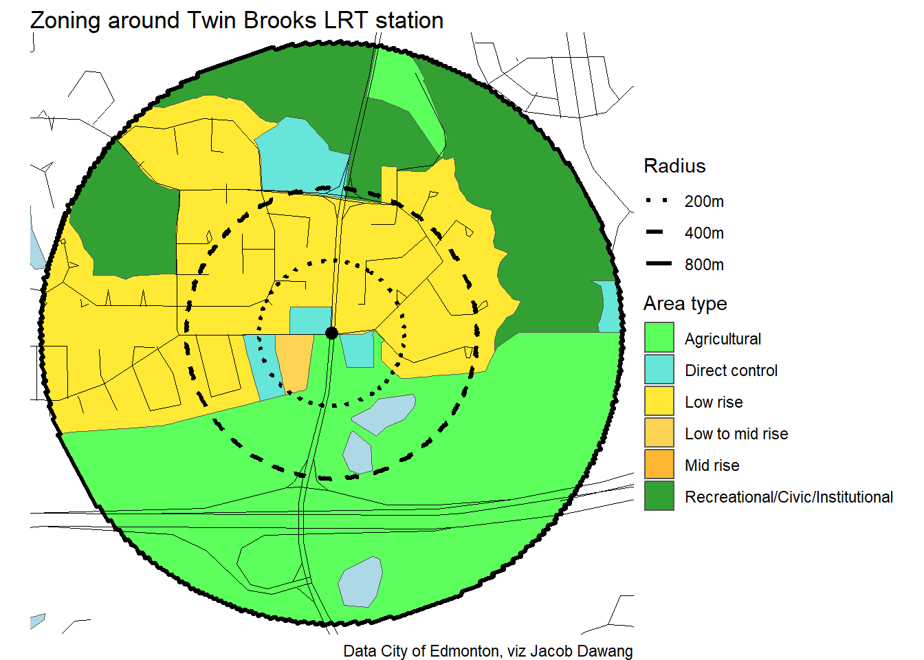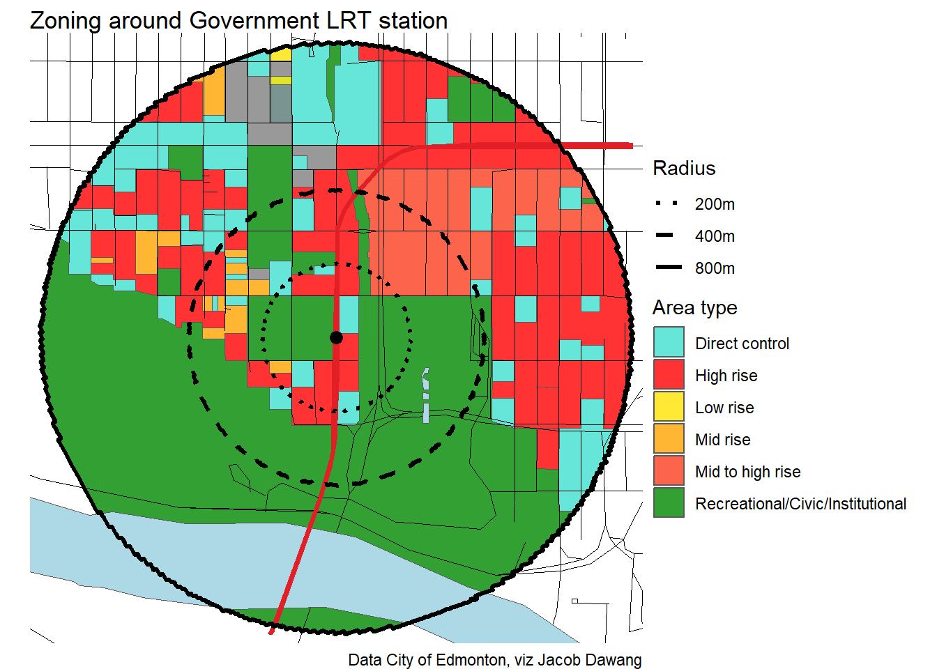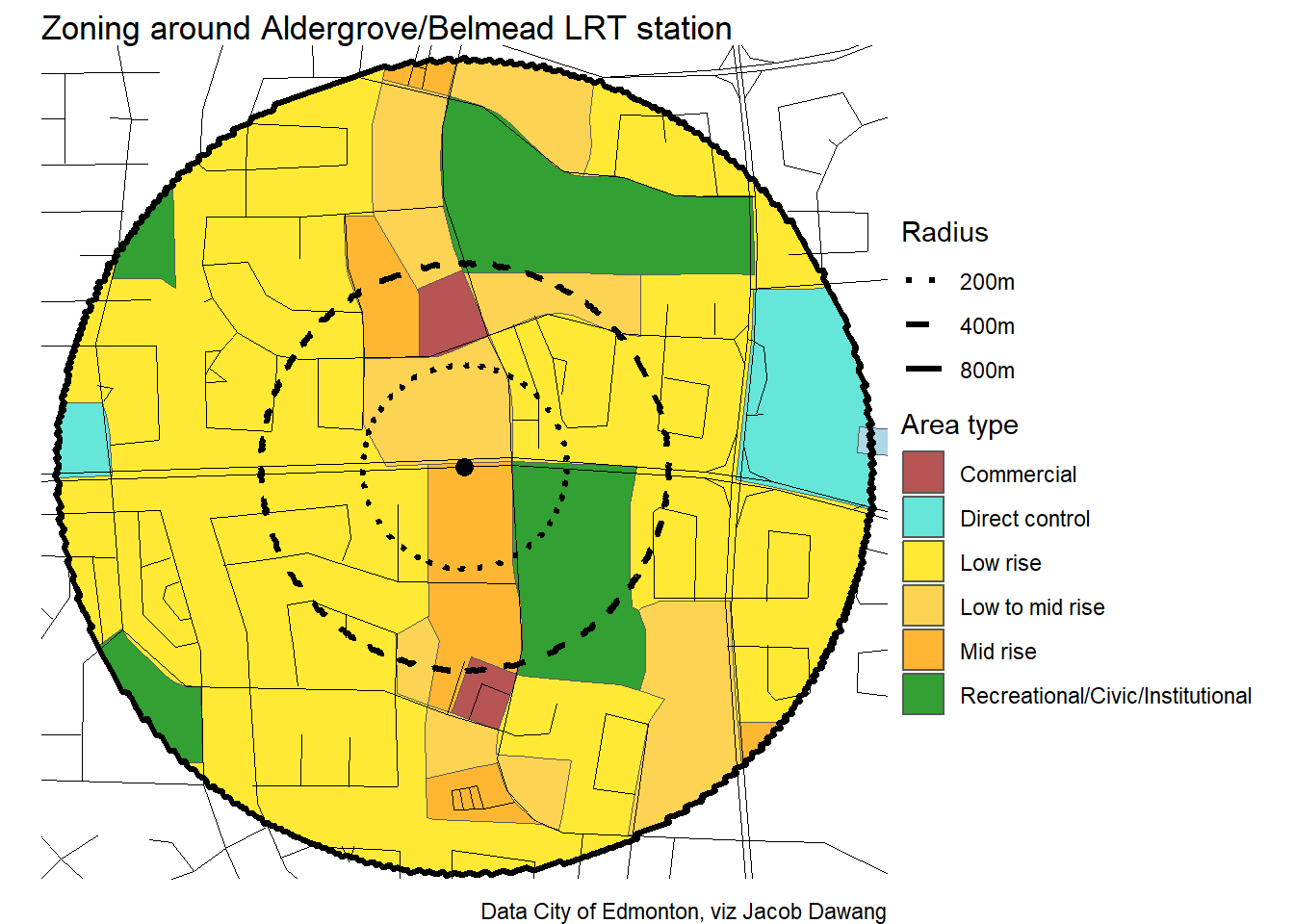 Administration has released the final draft district plans and policy with some minor changes to the policy and minor adjustments to the boundaries of some nodes and corridors. With this, they have also thankfully released open data for the node and corridor boundaries, which makes compiling plots and maps easier. Given this new data, I’m redoing all the charts and maps from my previous post where I looked at what planning permissions district planning would give around Edmonton’s current and funded LRT stations.