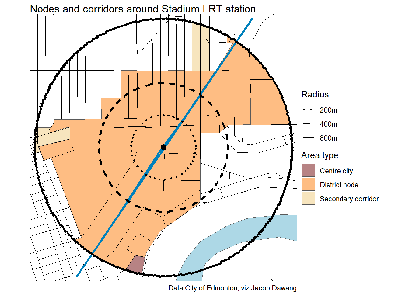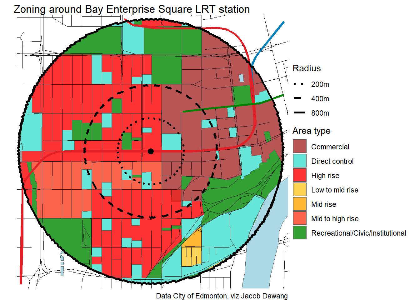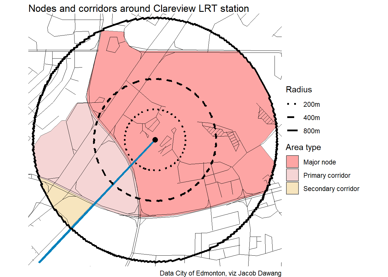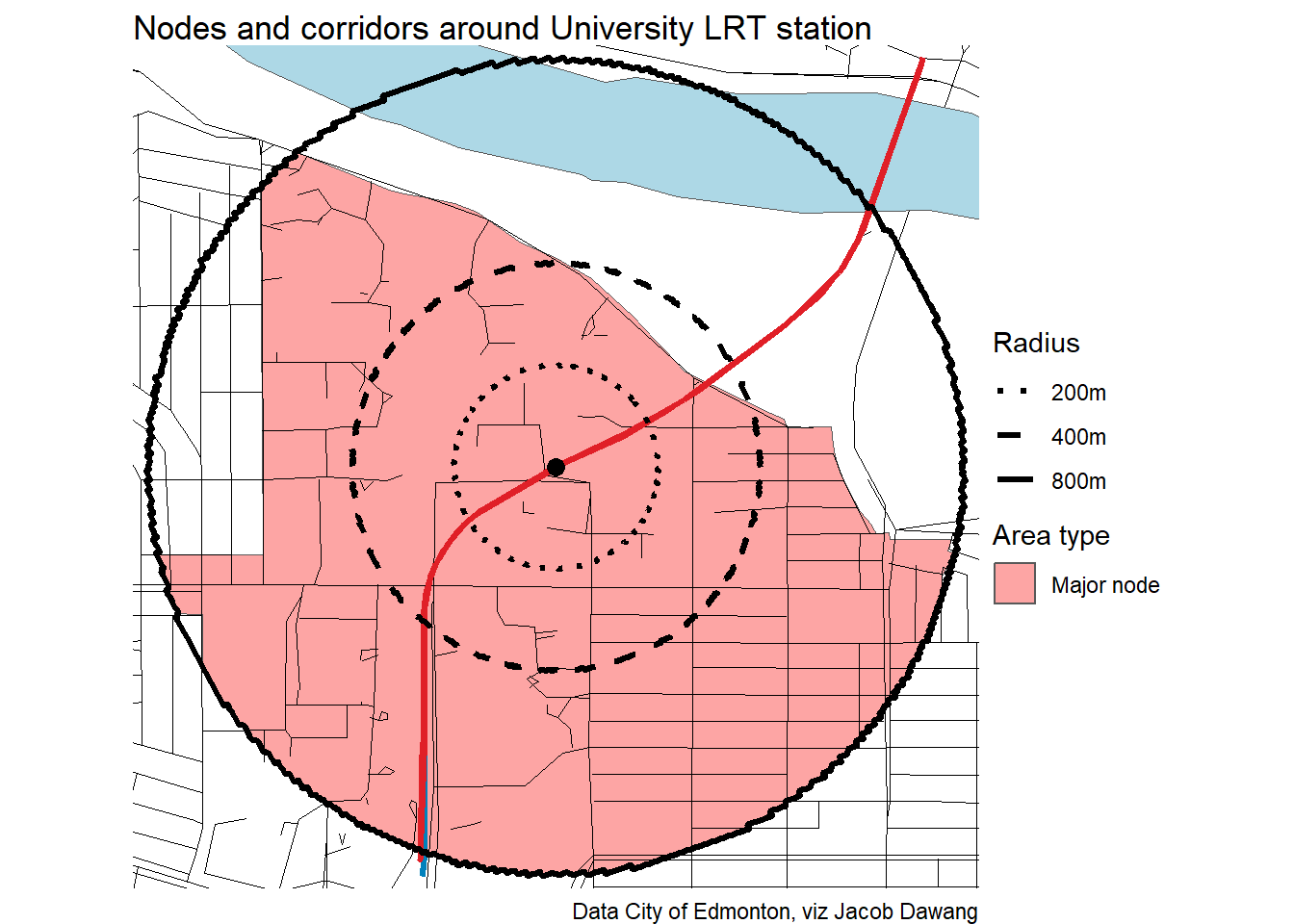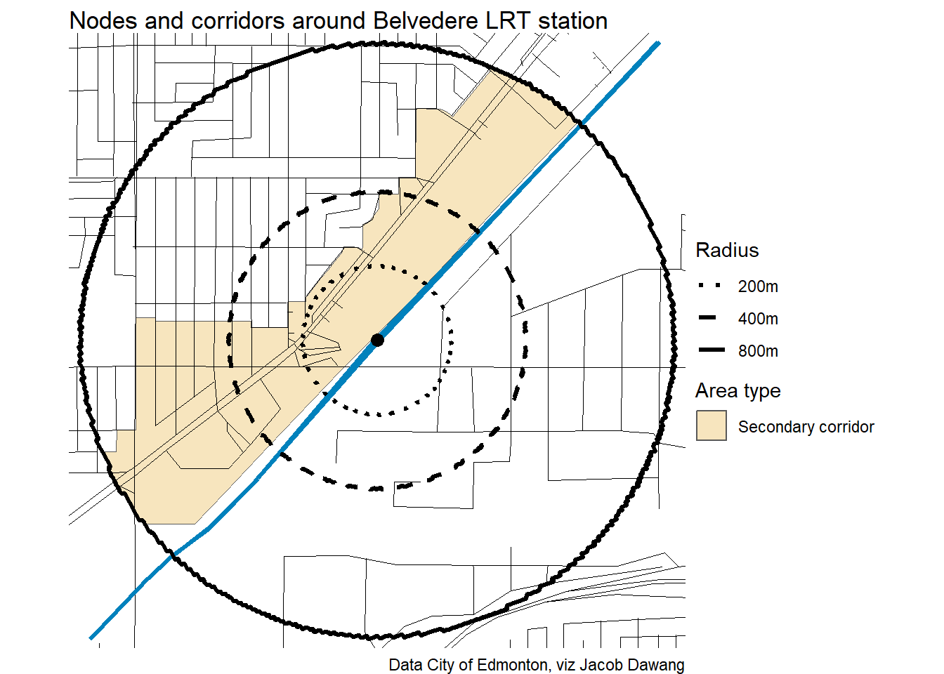 Administration has released the final draft district plans and policy with some minor changes to the policy and minor adjustments to the boundaries of some nodes and corridors. With this, they have also thankfully released open data for the node and corridor boundaries, which makes compiling plots and maps easier. Given this new data, I’m redoing all the charts and maps from my previous post where I looked at what planning permissions district planning would give around Edmonton’s current and funded LRT stations.
