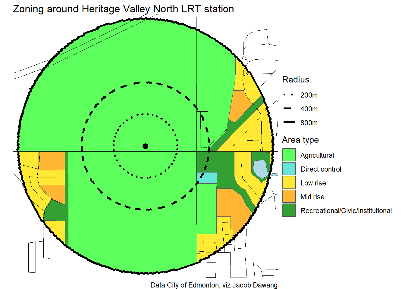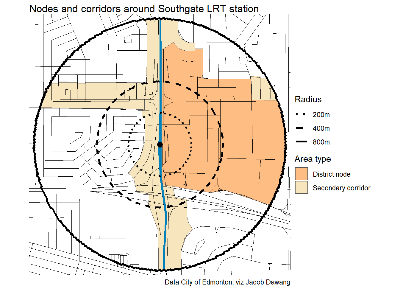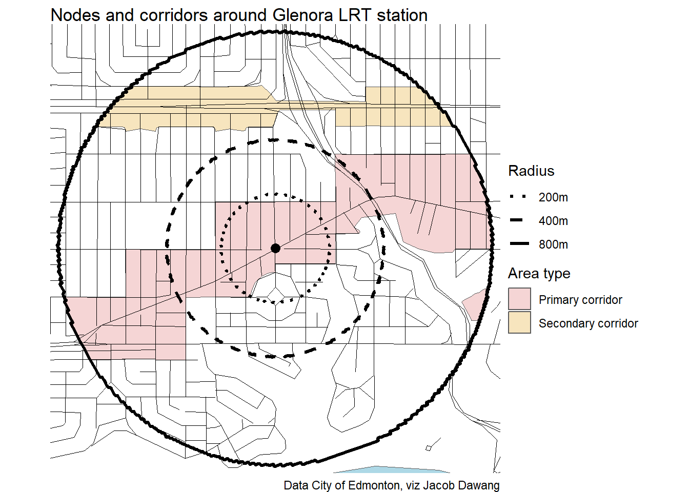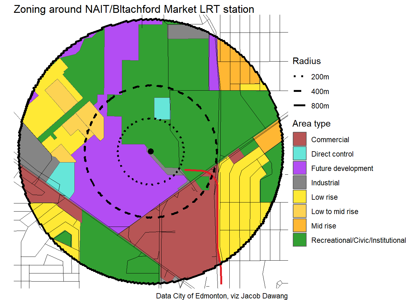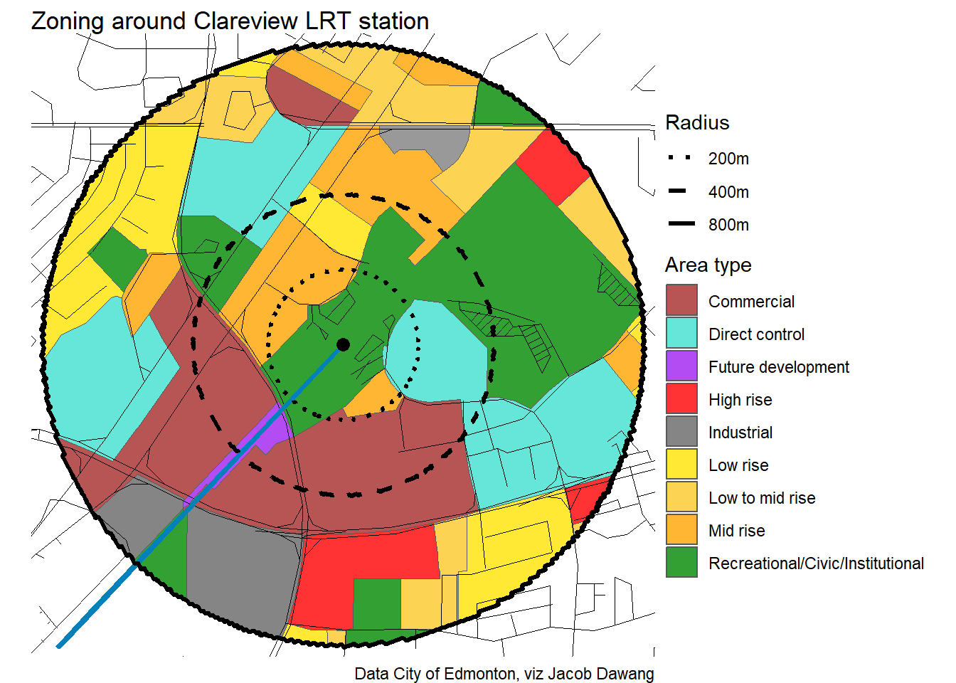 Administration has released the final draft district plans and policy with some minor changes to the policy and minor adjustments to the boundaries of some nodes and corridors. With this, they have also thankfully released open data for the node and corridor boundaries, which makes compiling plots and maps easier. Given this new data, I’m redoing all the charts and maps from my previous post where I looked at what planning permissions district planning would give around Edmonton’s current and funded LRT stations.