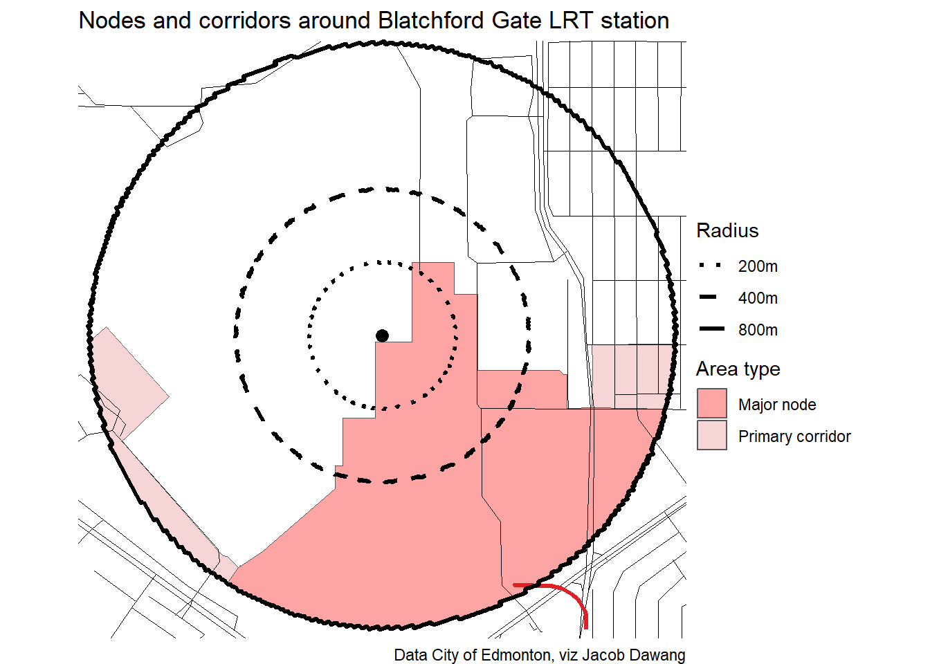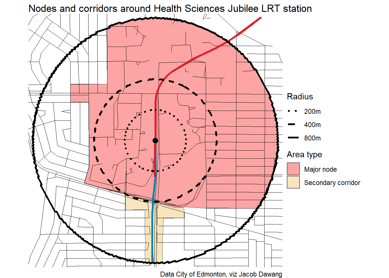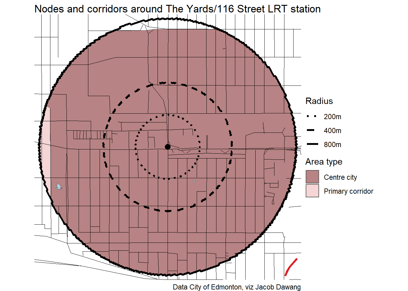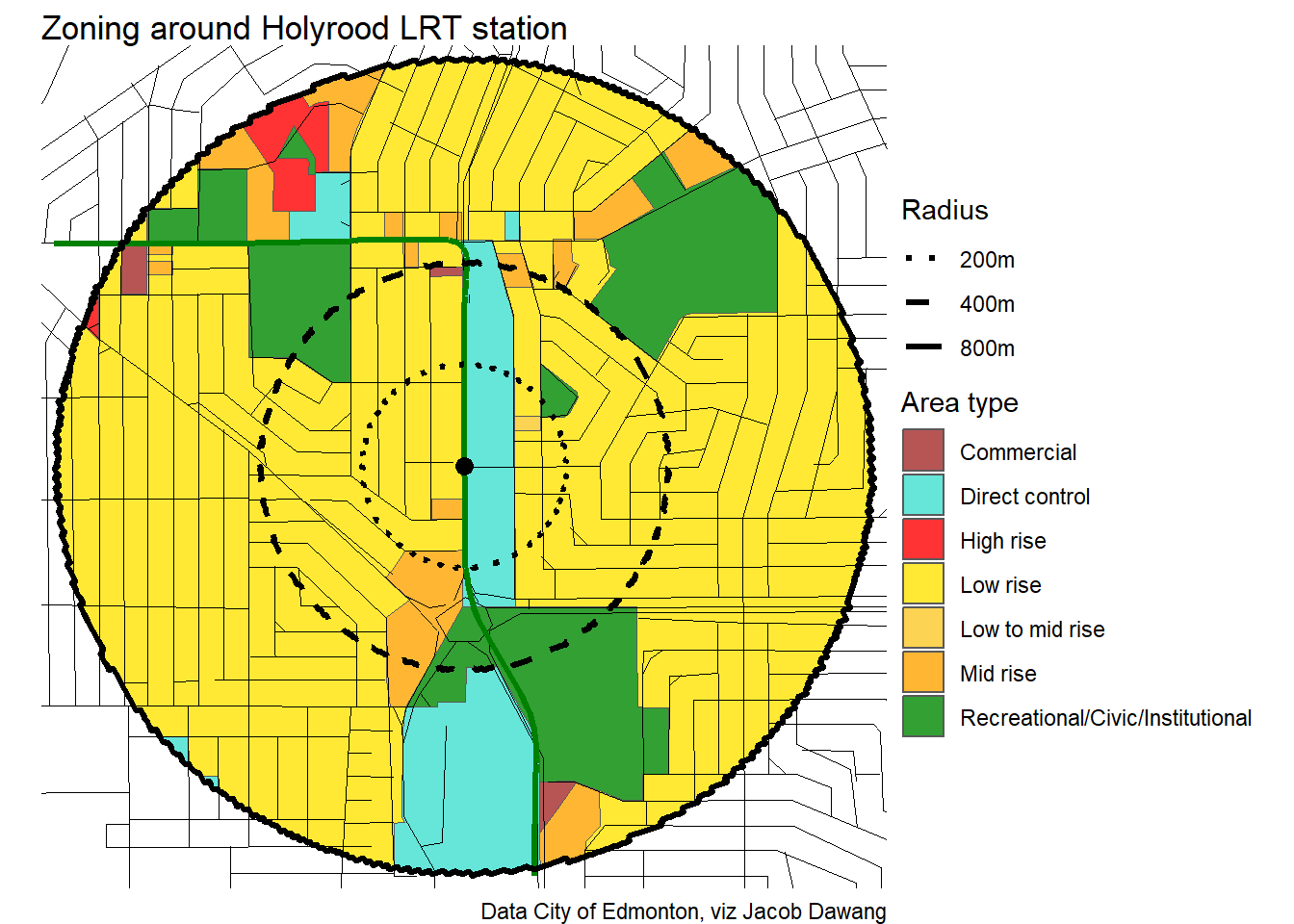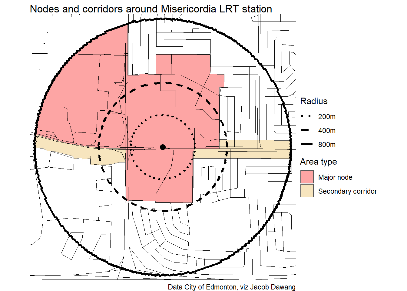 Administration has released the final draft district plans and policy with some minor changes to the policy and minor adjustments to the boundaries of some nodes and corridors. With this, they have also thankfully released open data for the node and corridor boundaries, which makes compiling plots and maps easier. Given this new data, I’m redoing all the charts and maps from my previous post where I looked at what planning permissions district planning would give around Edmonton’s current and funded LRT stations.
