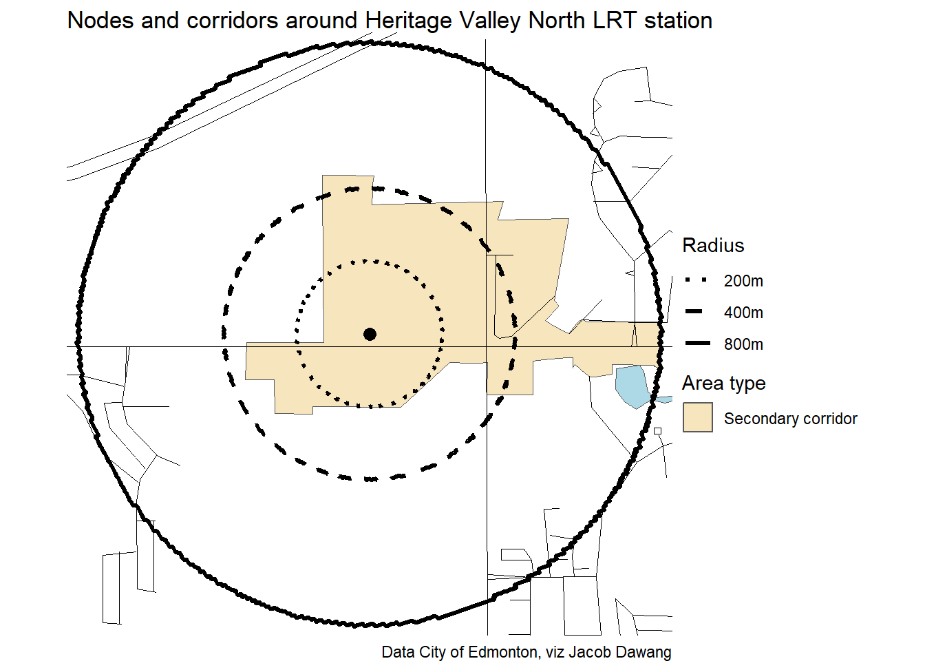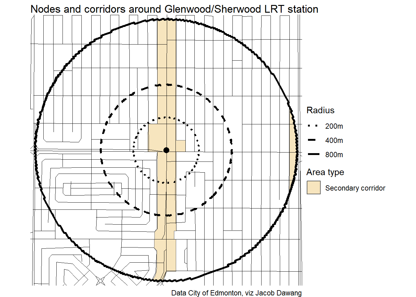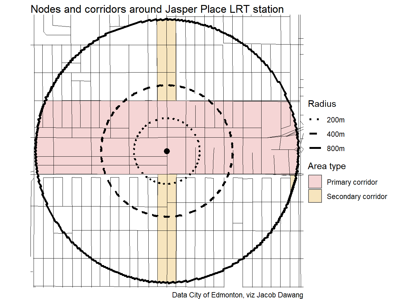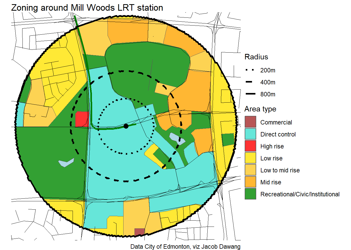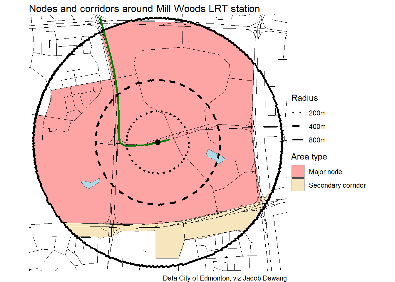 Administration has released the final draft district plans and policy with some minor changes to the policy and minor adjustments to the boundaries of some nodes and corridors. With this, they have also thankfully released open data for the node and corridor boundaries, which makes compiling plots and maps easier. Given this new data, I’m redoing all the charts and maps from my previous post where I looked at what planning permissions district planning would give around Edmonton’s current and funded LRT stations.