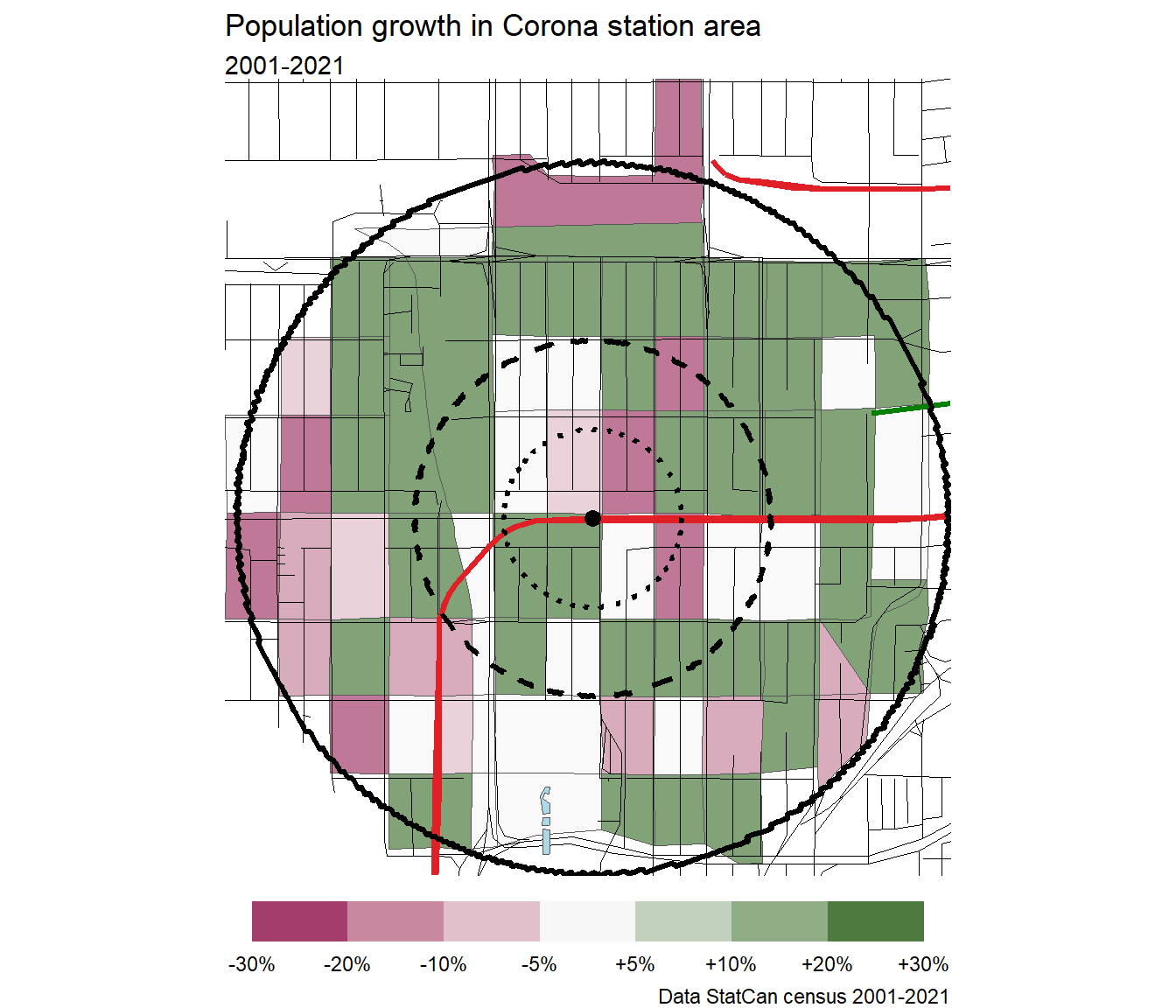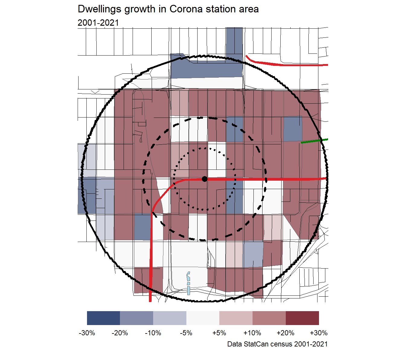 Here, I have combined the nodes and corridors, somewhat subjectively, into larger density buckets to compare them with British Columbia’s new TOD policy.